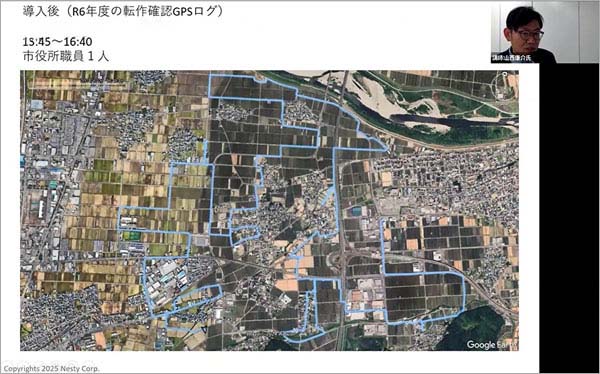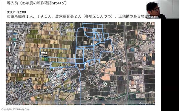 導入前は、3時間で2地域を廻ることができました。同行したのは、職員1名、JA1名、各地域の農家組合長1名ずつで合計2名、さらに、土地勘のある農家さん1名の合計5名でした。日程を決める際、この全員の都合を調整しなければなりません。こういった点も表には出てこない自治体の方の負担です。